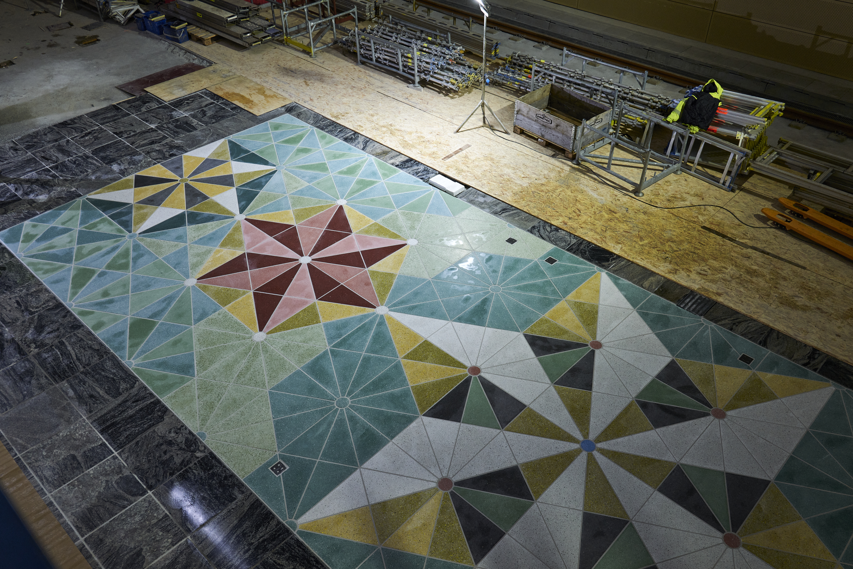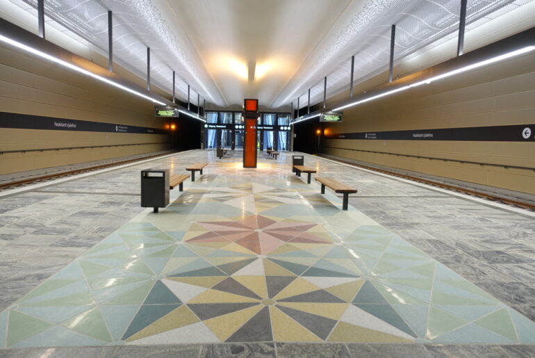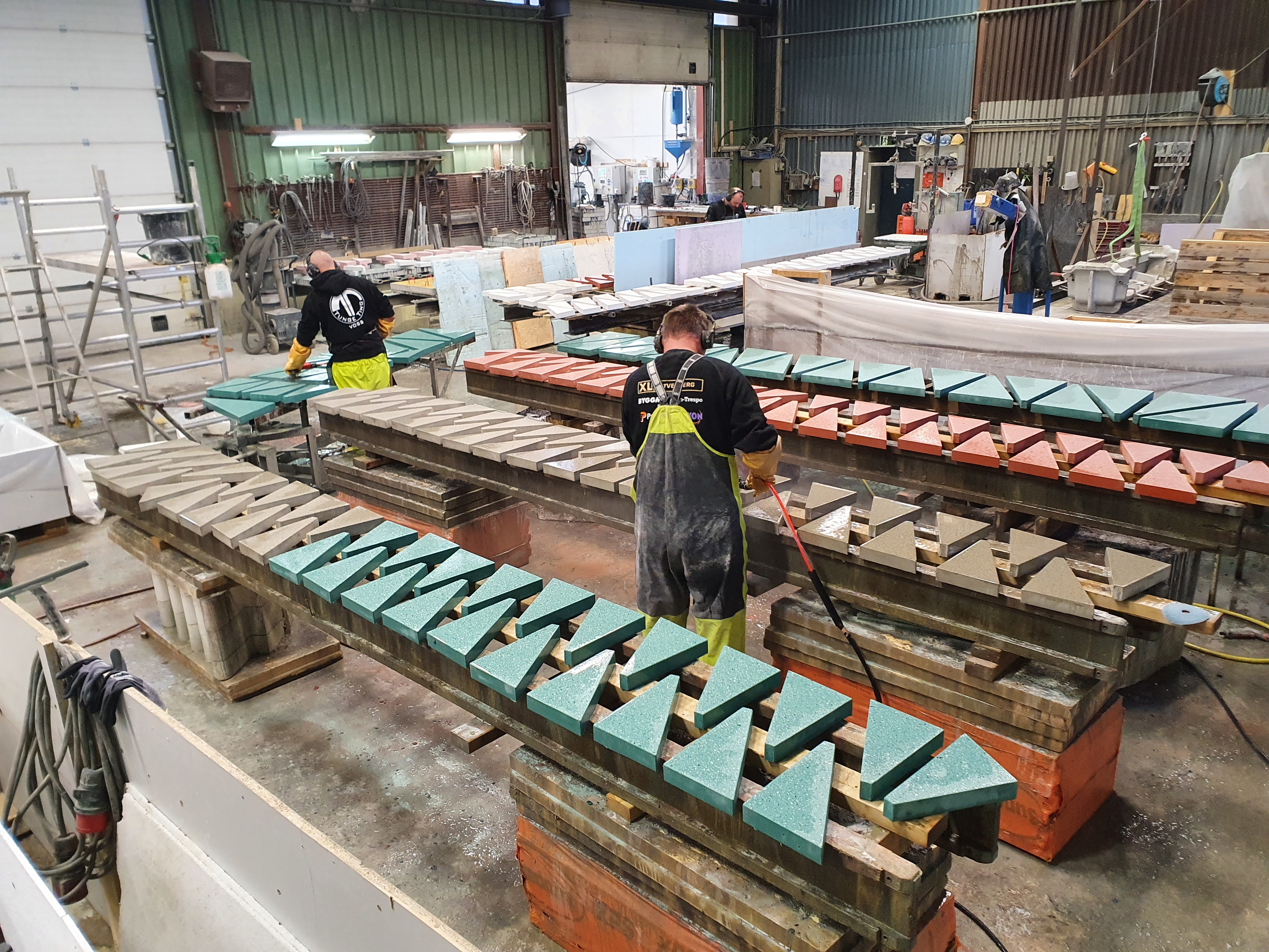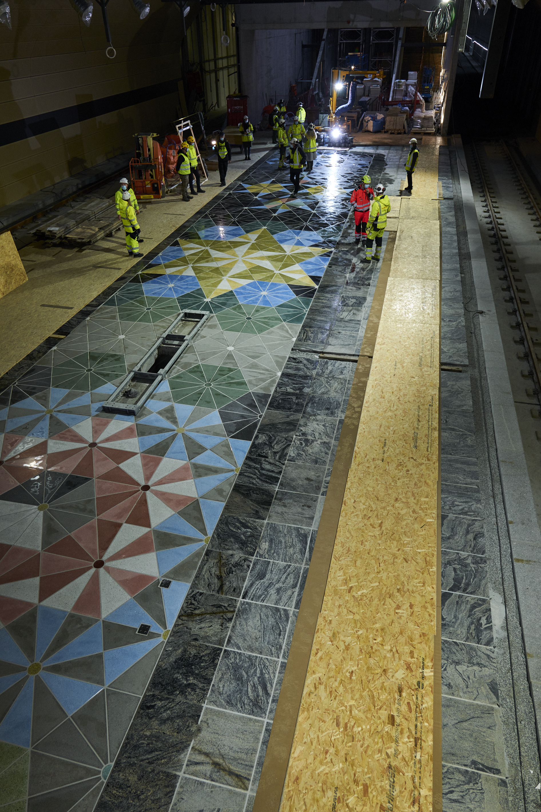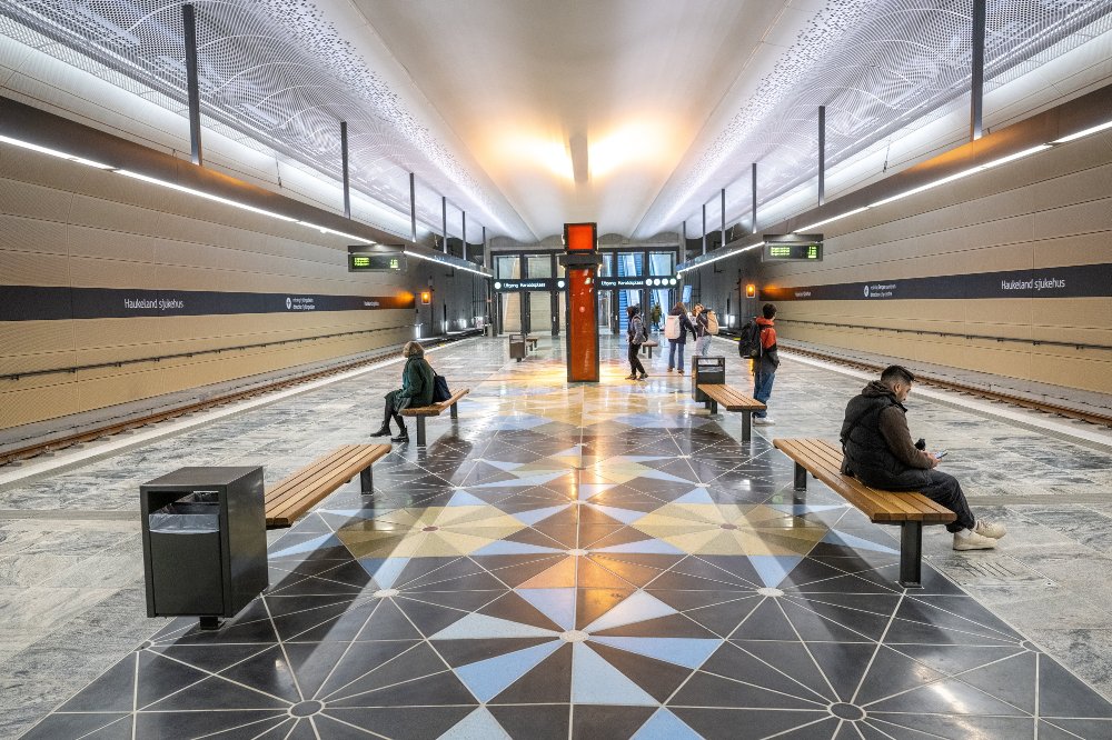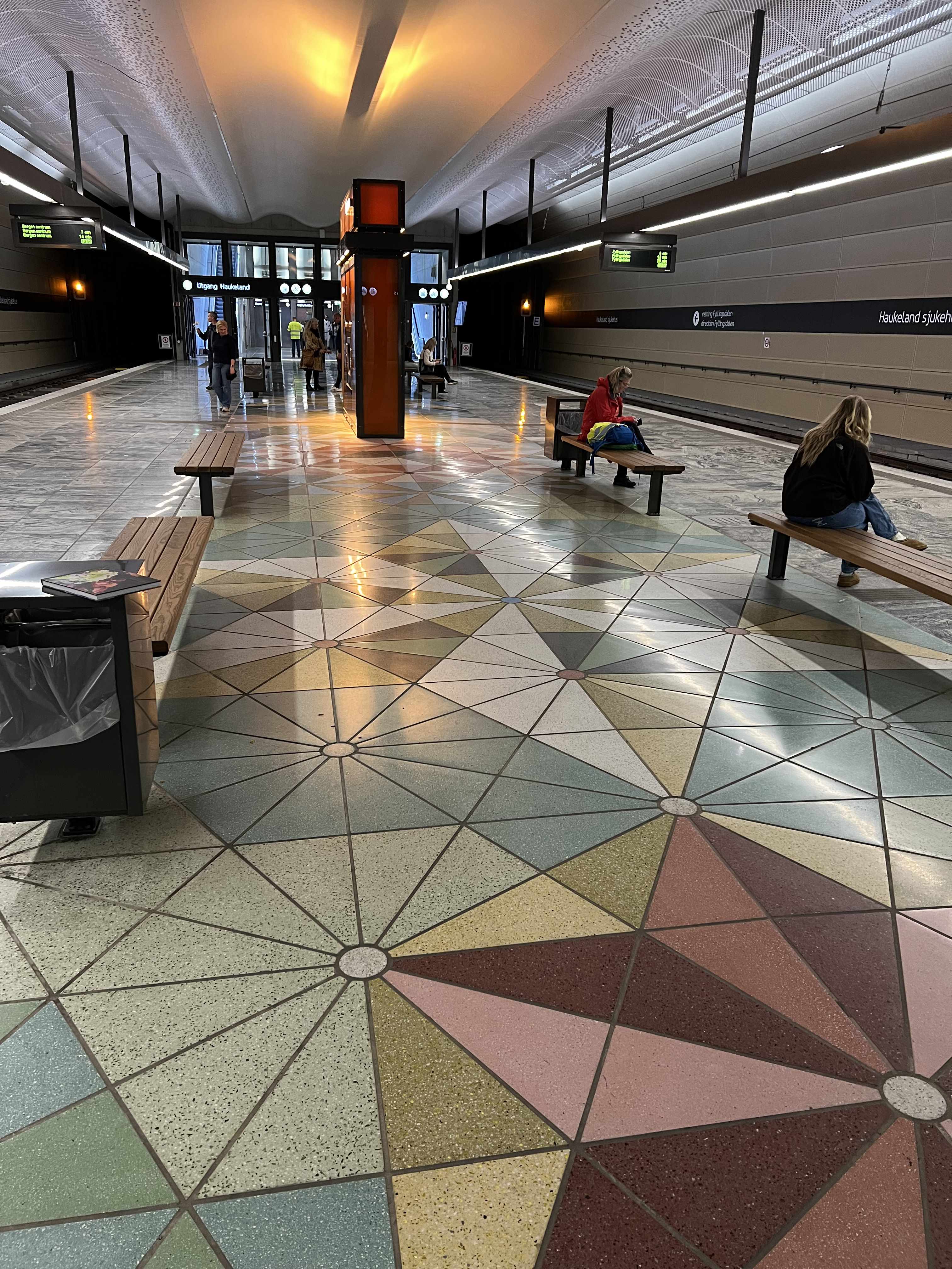 Kunstner Inger Johanne Rasmussen ble tildelt oppdraget med å utsmykke Haukeland stasjon for Bybanen i Bergen. Vi fikk jobben med å produsere nesten 3500 enkeltfliser i 17 forskjellige kollører.
