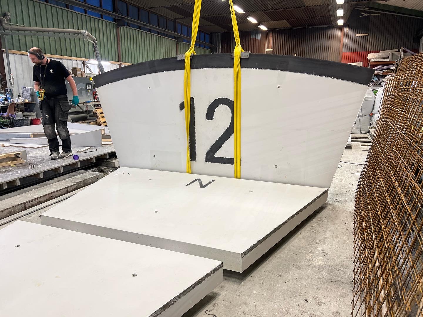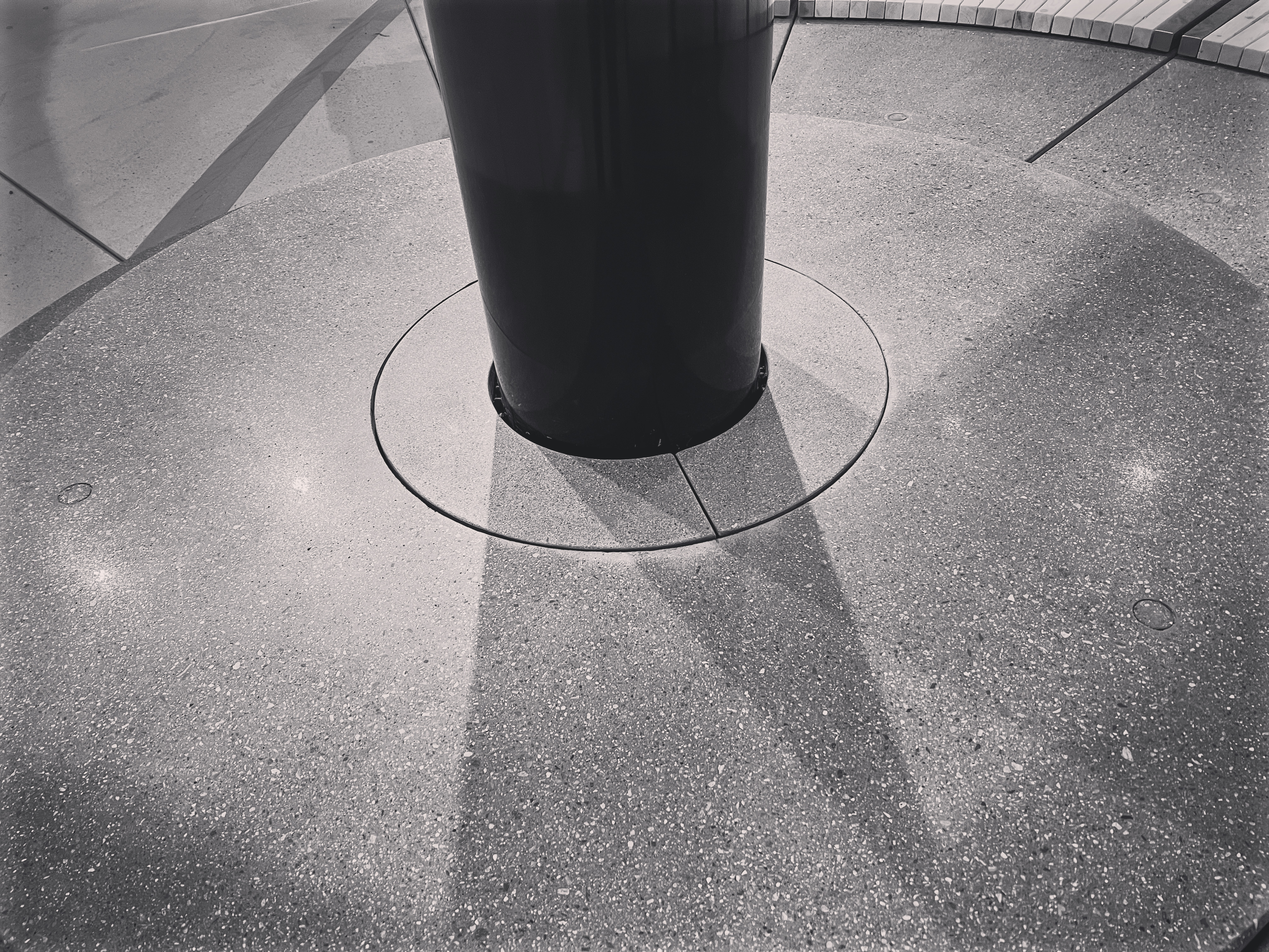 Vi produsert og og monterte her en kjempestor urskive med innfelte tall som dekkeelementer. I senter er det en stor benkinstallasjon. Alt i hvit og sort betong.