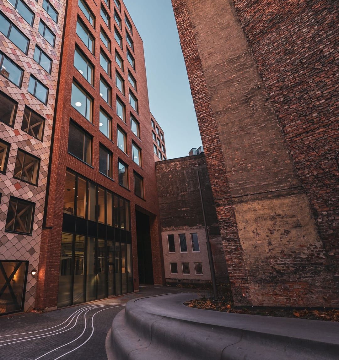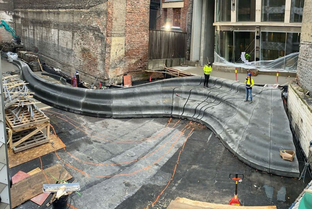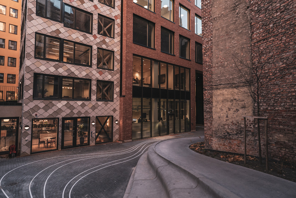 I bakgården i Kristian Augustsgate 13 har vi prefabrikert et amfi bestående av 18 elementer i sort betong med syrevasket overflate. Amfiet har en organisk form som trekker seg innover i det trange bakgårdsrommet.