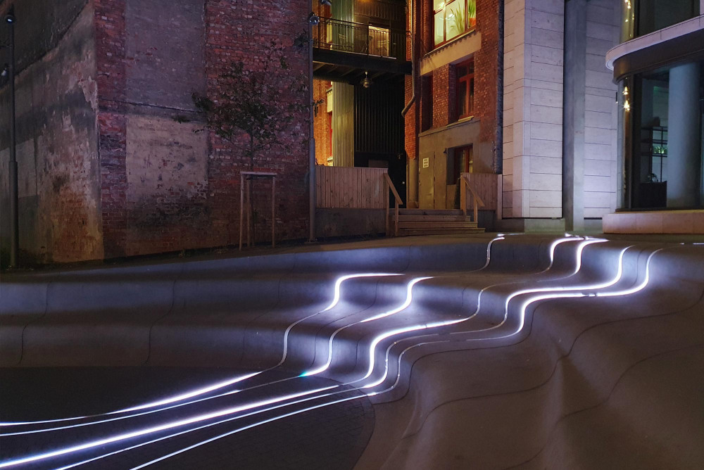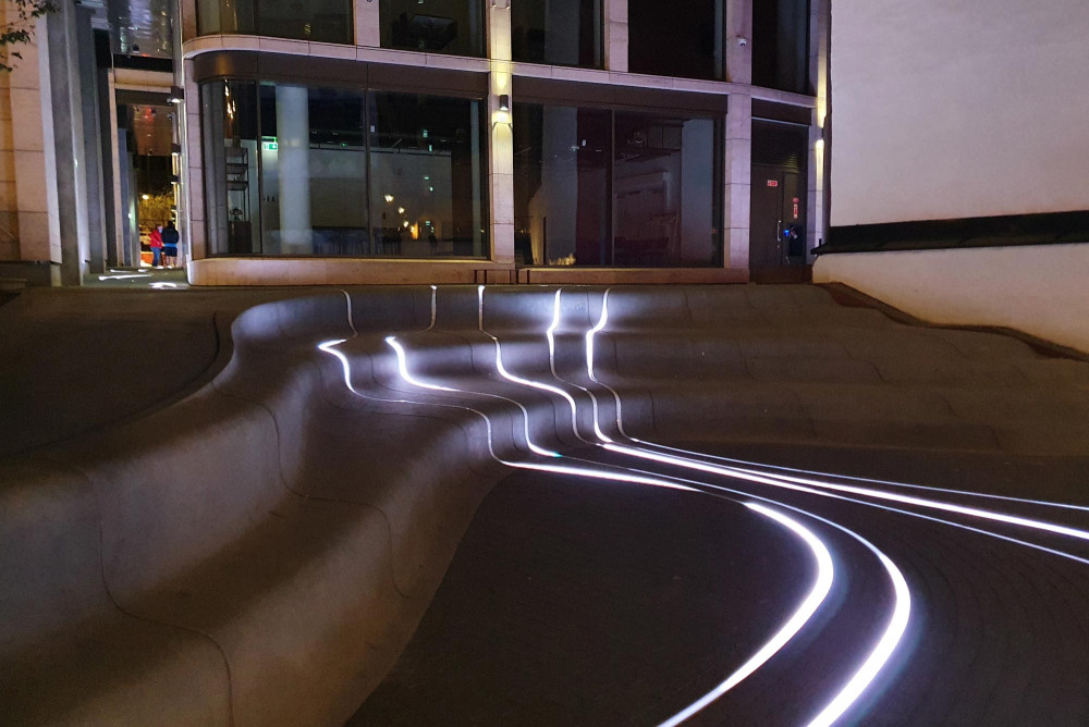 Gjennom hele amfiet og tilstøtende bygg går det flere baner med LED-lys som leder vei fra en gate til en annen. De største elementene står på stålrammer for å spre vekt. Vi fikk gjennomført dette spektakulære prosjektet takket være godt samarbeid med Easy Form AS og oppdragsgiver.