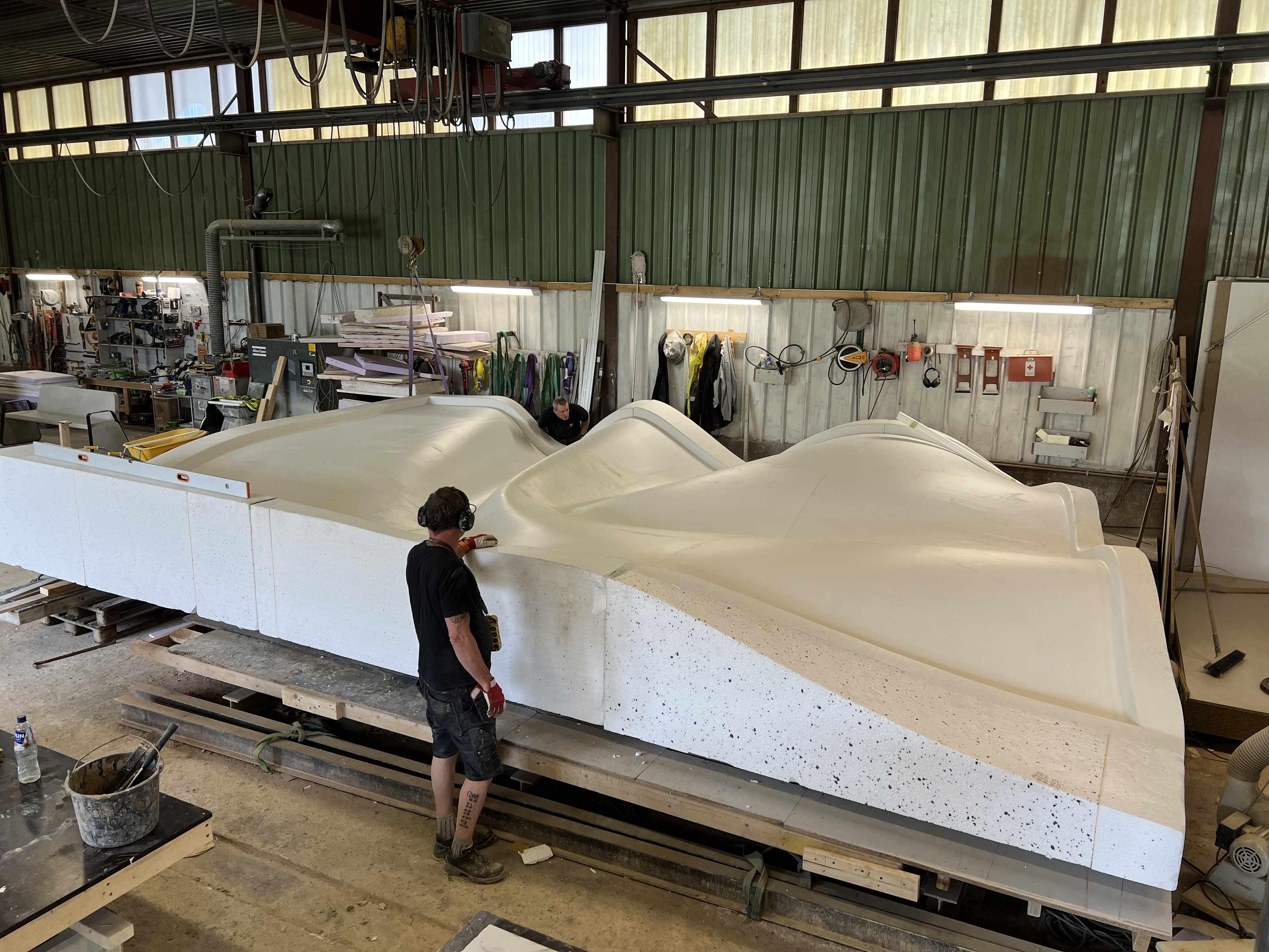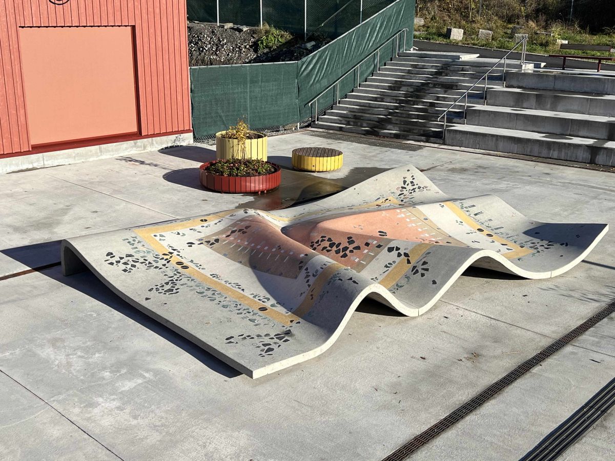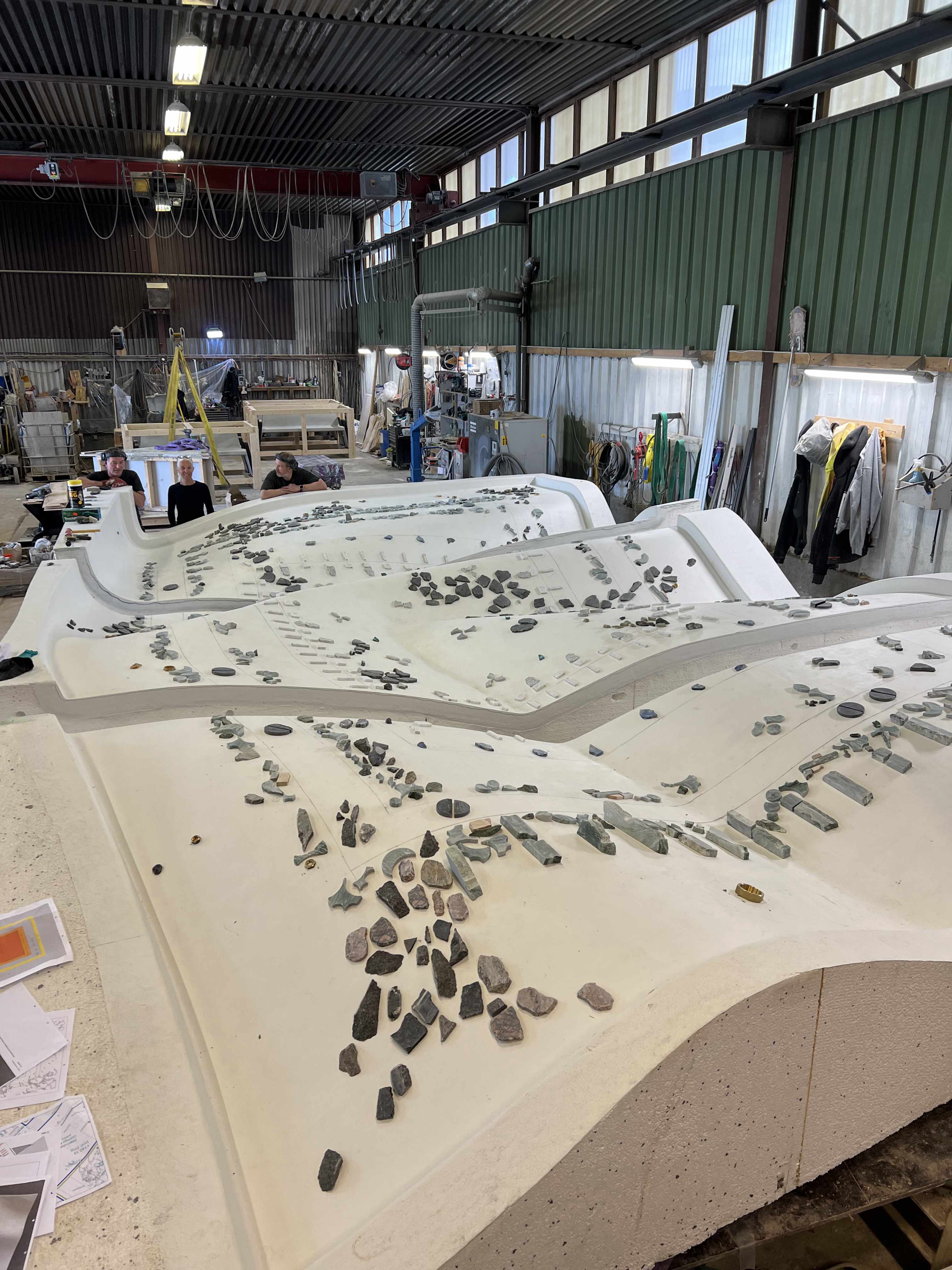 Støpt med forskjellige farger i hverandre. Kunstner har selv lagt inn steiner av ulik type i formern før utstøping. Alt er deretter slipt og polert.