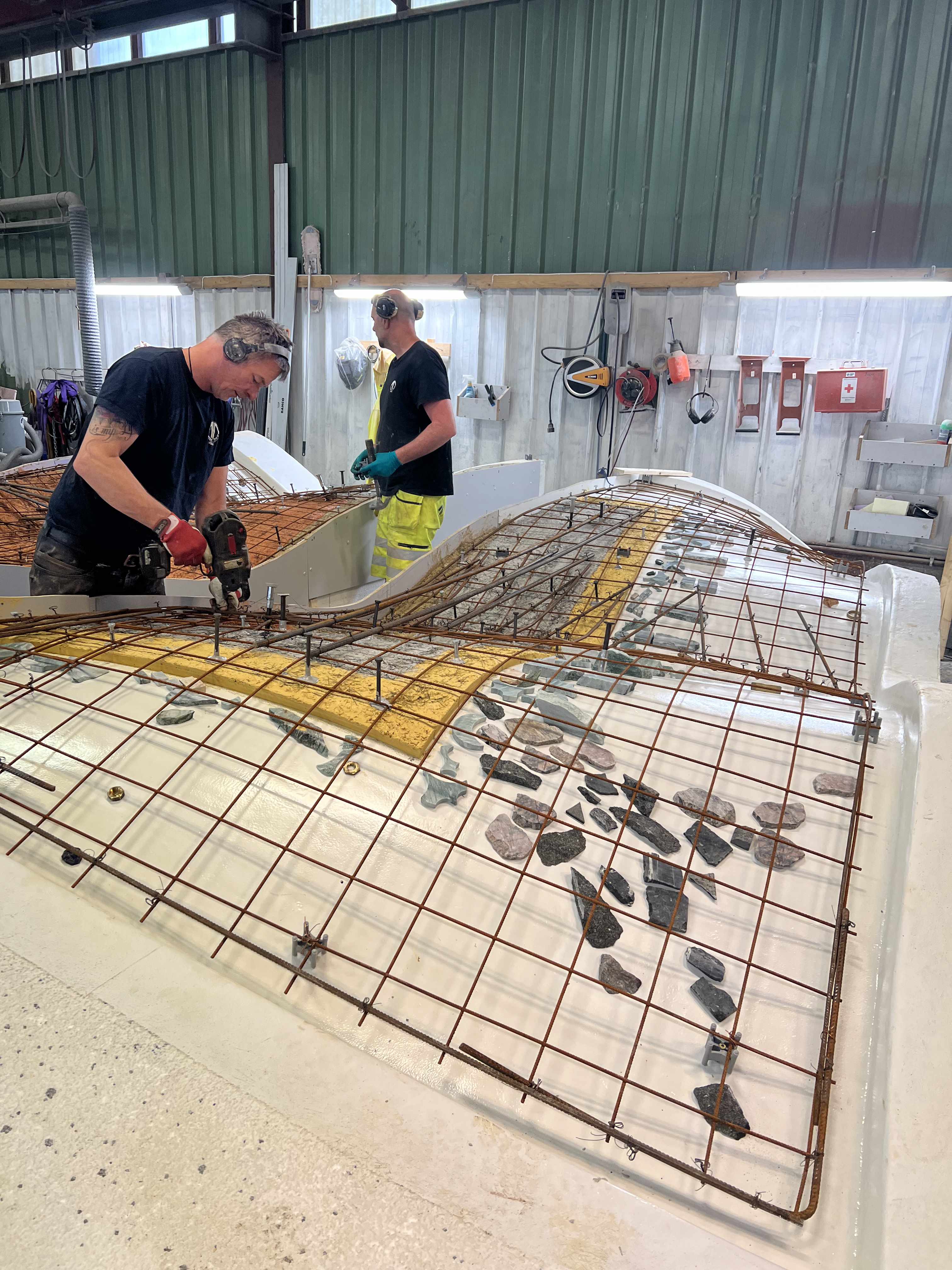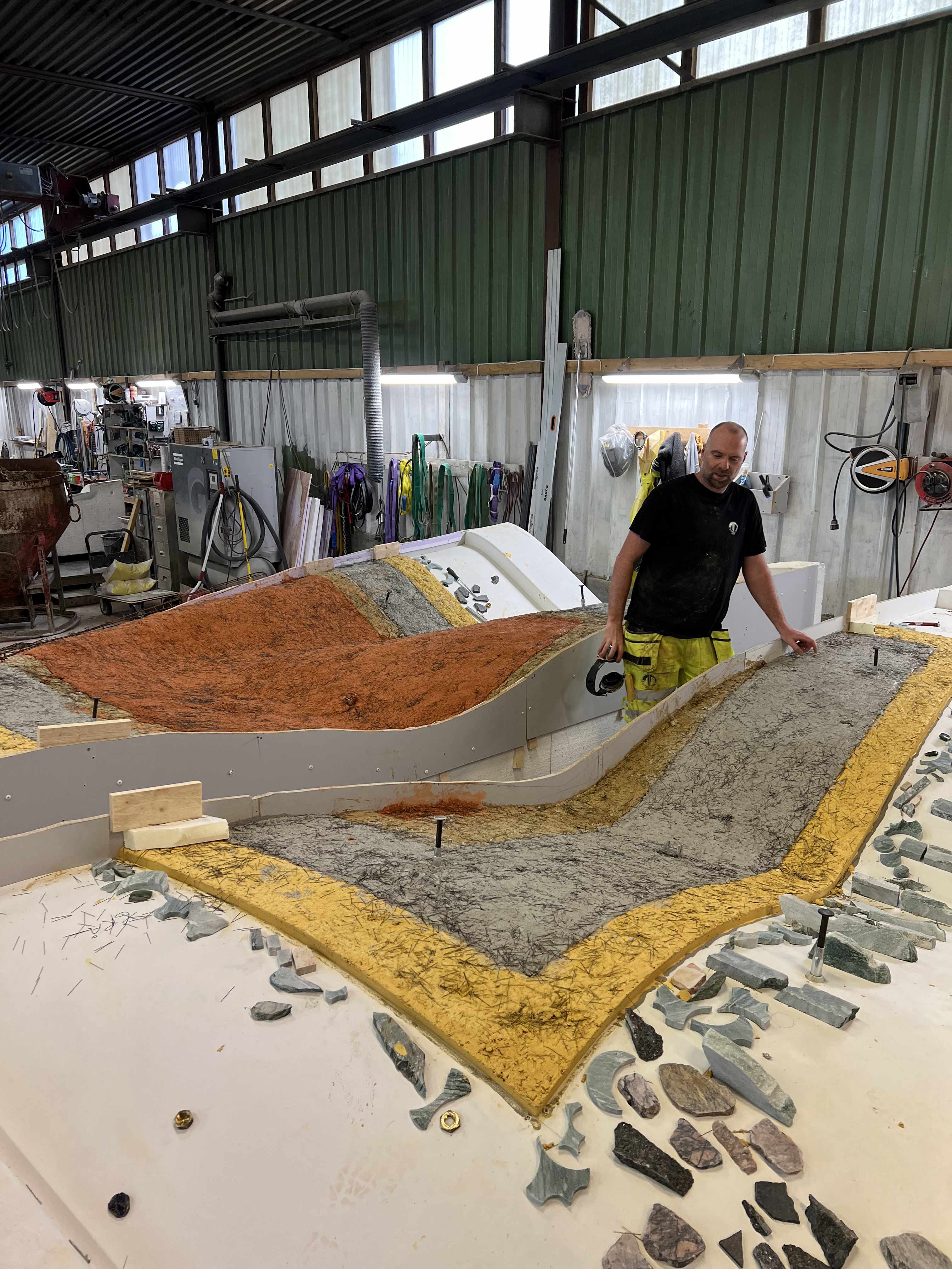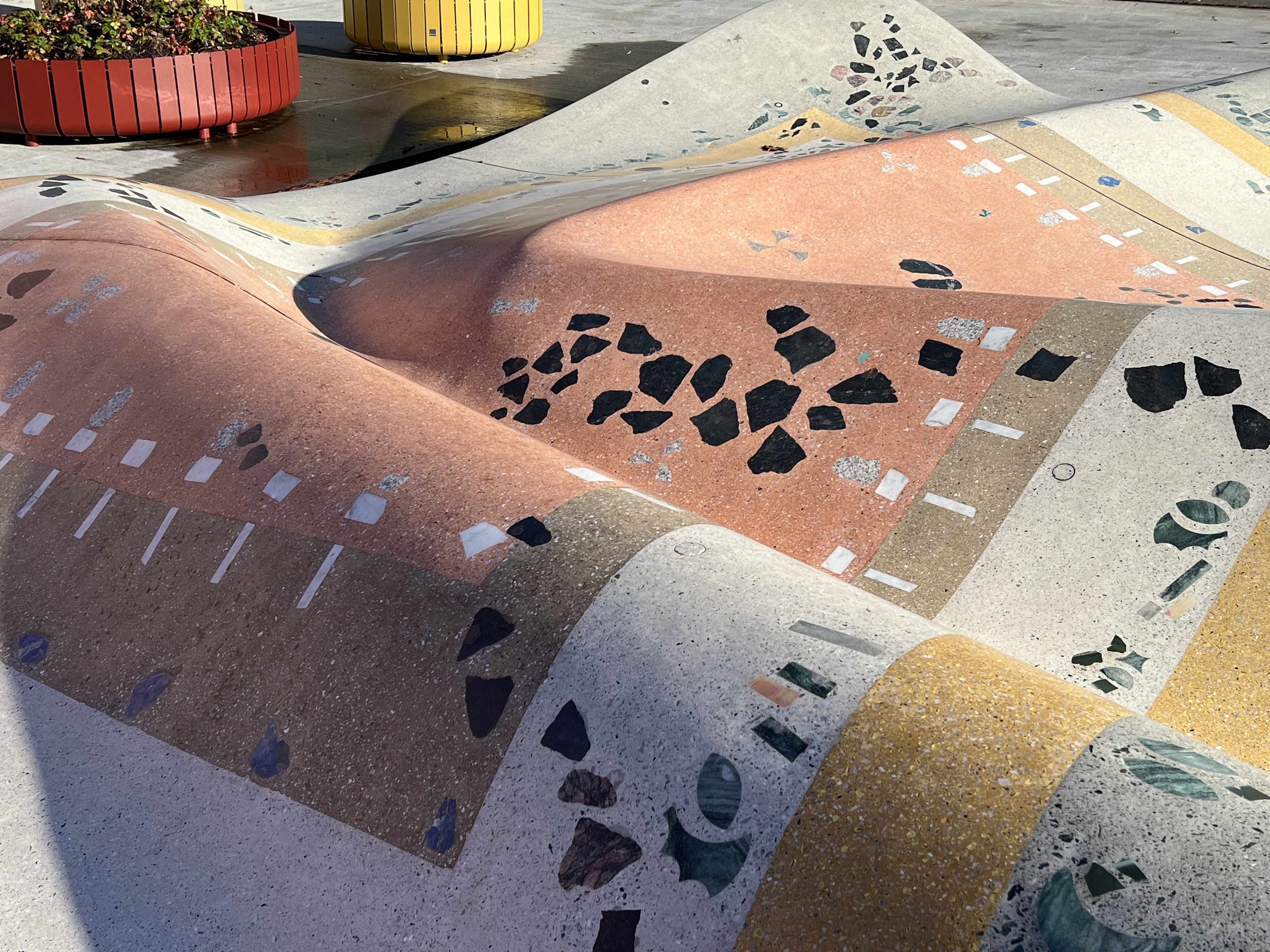 Støpt med forskjellige farger i hverandre. Kunstner har selv lagt inn steiner av ulik type i formern før utstøping. Alt er deretter slipt og polert.